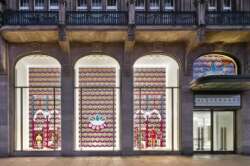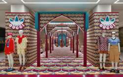 Das Design des Pop-ups spielt mit der kaleidoskopischen Ästhetik der Kollektion. Die Fläche wird von beleuchteten Spitzbögen eingefasst, die durch vintage-inspirierte Möbel ergänzt werden. Elemente des Set-ups sind vollständig mit einem Retroprint aus der Kollektion überzogen, der ebenfalls das GG-Monogramm mit dem Trefoil-Logo von Adidas verbindet und so die Synergien der beiden Traditionsmarken verstärkt.